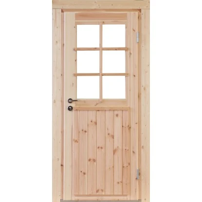 Die schwere Wolff Finnhaus Halbglas-Einzeltür Finn XL 34 aus Leimholz ist geeignet für Gartenhäuser mit 34 mm Wandstärke. Die Türschwelle, sowie die Drückergarnitur sind aus Edelstahl und verleihen der Tür somit einen hochwertiges Äußeres. Die XL Variante zeichnet sich durch seine extra hohe Durchgangshöhe.