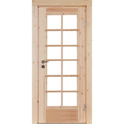Die Wolff Finnhaus Vollglas-Einzeltür Nils mit Sprossen für Gartenhäuser mit 28 mm Wandstärke ist eine leicht einbaubare Tür aus Leimholz.