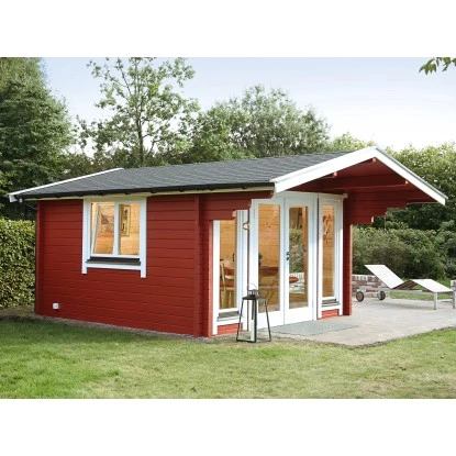 Das Gartenhaus aus Holz überzeugt durch sein modernes Design. Es eignet sich für den universellen Einsatz als Geräteschuppen, Gartenpavillon oder Freizeithaus.