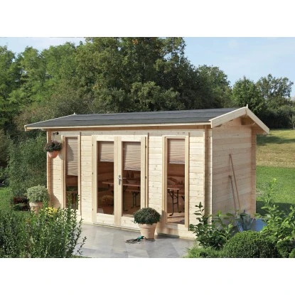 Das Gartenhaus aus Holz überzeugt durch sein modernes Design. Es eignet sich für den universellen Einsatz als Geräteschuppen, Gartenpavillon oder Freizeithaus.