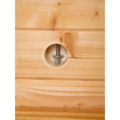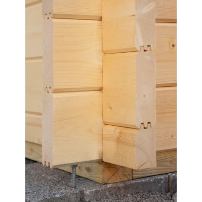 Das Gartenhaus ist in Blockbohlenbauweise aus unbehandeltem Holz gefertigt. Durch die naturbelassene Oberfläche bleibt eine natürliche Optik mit Holzmaserung erhalten. Zum Schutz vor Witterungseinflüssen sollte die Oberfläche individuell mit einer Lackierung oder Lasierung veredelt werden. Das Gerätehaus verfügt über eine robuste Konstruktion, mit einer Wandstärke von 44 mm. Die maximalen Schneelast des Pultdachs liegt bei 130 kg/m. Die Dacheindeckung in Form von Dachpappe ist bereits im Lieferumfang enthalten.