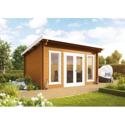 Das Gartenhaus ist aus lasiertem Holz in Blockbohlenbauweise gefertigt. Durch die Lasierung bleibt eine natürliche Optik mit Holzmaserung erhalten und das Gartenhaus vor Verwitterung geschützt. Das Gerätehaus verfügt über eine stabile Konstruktion. Die maximalen Schneelast des Pultdachs liegt bei 140 kg/m. Die Dacheindeckung in Form von Dachpappe ist bereits im Lieferumfang enthalten.