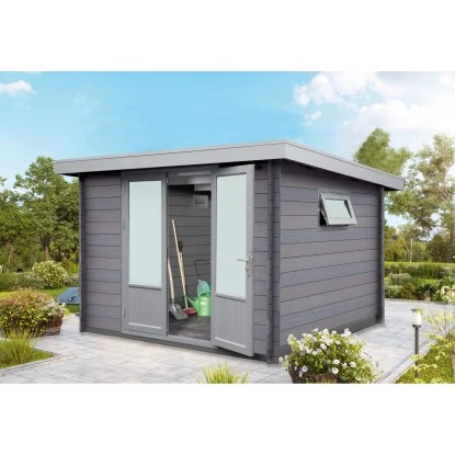 Das Wolff Finnhaus Gerätehaus aus Kunststoff in Grau ist besonders praktisch gestaltet. Das klassische Gartenhaus eignet sich für den universellen Einsatz als Geräteschuppen, Gartenpavillon oder Freizeithaus.