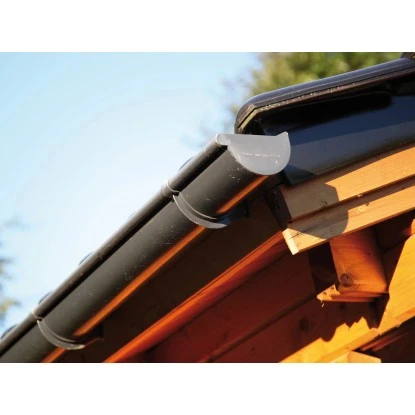Die zweiseitige Wolff Finnhaus Kunststoff-Rinne 482K mit zwei Fallrohren eignet sich für die Wolff Finnhaus Grillkota 9.