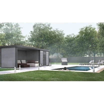 Das Metall-Gartenhaus überzeugt durch seine ansprechende Optik und ist dabei in schlichtem Lichtgrau gehalten.