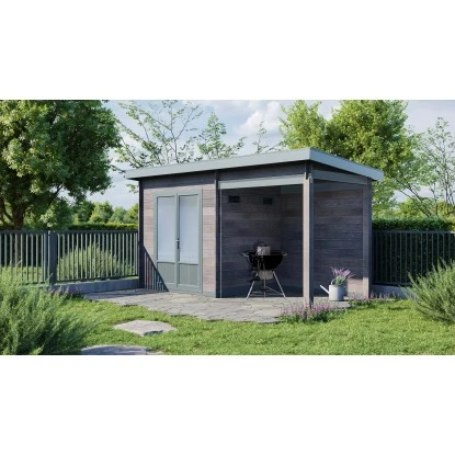 Das Gartenhaus aus Holz überzeugt durch sein modernes Design. Es eignet sich für den universellen Einsatz als Geräteschuppen, Gartenpavillon oder Freizeithaus.