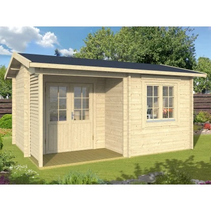 Das Gartenhaus ist aus unbehandeltem Holz in Blockbohlenbauweise gefertigt. Durch die naturbelassene Oberfläche bleibt eine natürliche Optik mit Holzmaserung erhalten. Zum Schutz vor Witterungseinflüssen sollte die Oberfläche individuell mit einer Lackierung oder Lasierung veredelt werden. Das Gartenhaus verfügt über eine stabile Konstruktion, mit einer Wandstärke von 44 mm. Die maximalen Schneelast des Satteldachs liegt bei 125 kg/m. Die Dacheindeckung ist separat erhältlich.