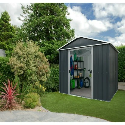 Das robuste Yardmaster Metallgerätehaus Heidelberg 65AEYZ in der Farbe Anthrazit bietet eine sichere Lösung für die Outdoor-Lagerung Ihrer Gartengeräte, Gartenmöbel, Kinderspielzeug, Fahrräder und anderer Besitztümer.